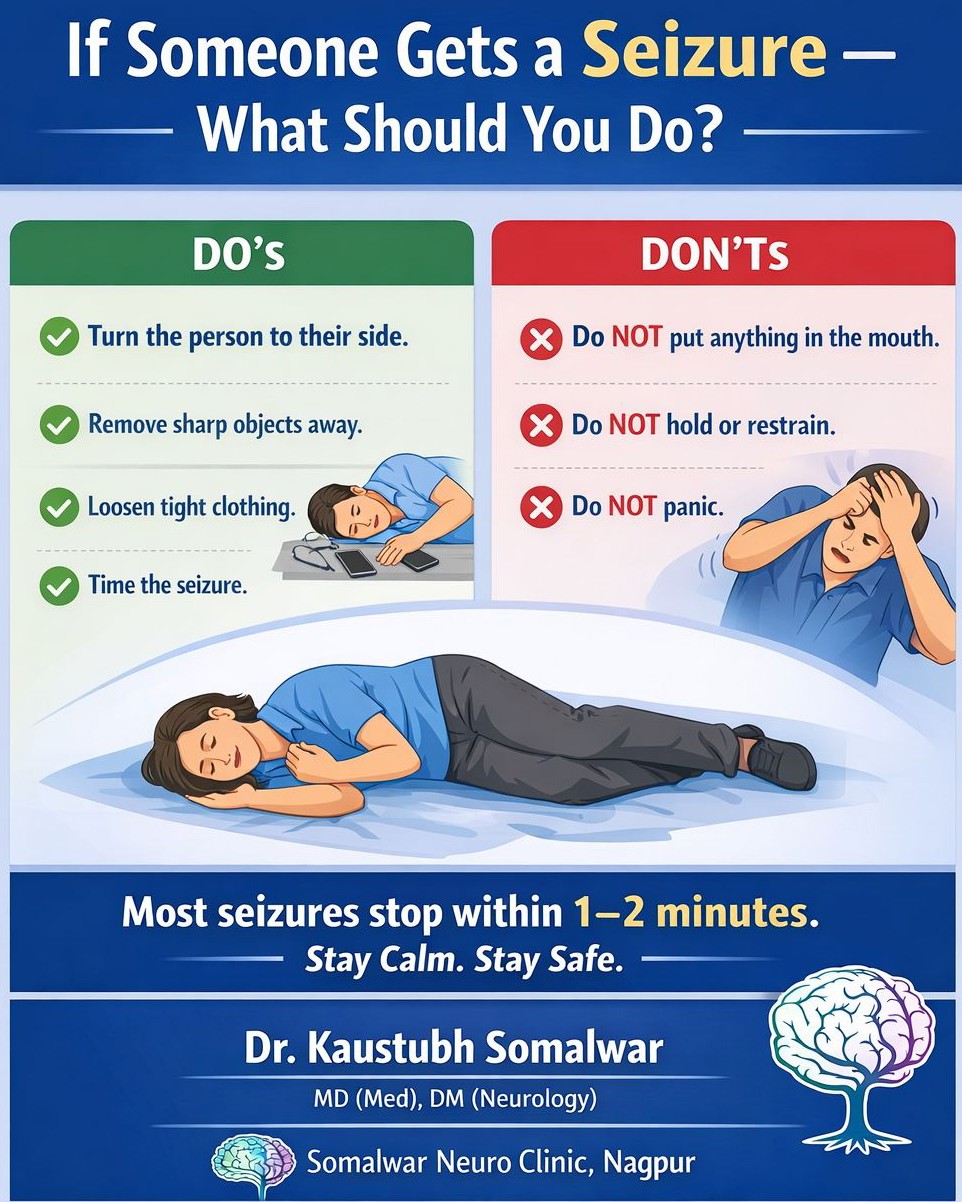Many people still follow wrong practices during seizures. Putting a spoon in the mouth or holding the person tightly can cause serious injury. Remember: • Keep the person safe • Turn to the side after jerking reduces • Loosen tight clothes around the neck • Note the duration Call emergency services if: – Seizure lasts more than 5 minutes – Repeated seizures occur – Injury happens – It is first seizure Awareness saves lives. #SeizureFirstAid #EpilepsyAwareness #BrainHealth #NeurologistInNagpur #NeurologistInLaxmiNagar #NeurologistInRamdaspeth #SomalwarNeuroClinic #NagpurDoctors